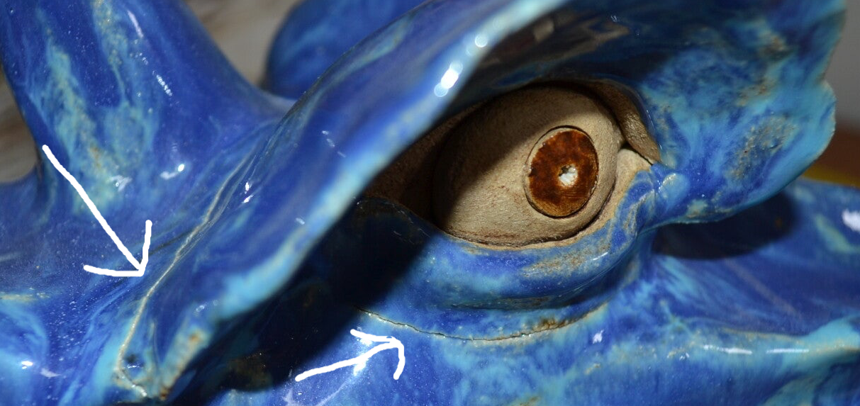 Vielleicht ist es passiert, weil er kurz vorm Jahreswechsel geboren wurde. Und ich damals noch so ziemlich die Augen vor allem verschlossen hatte. Jedenfalls sind bei seinem ersten Brand die Augen beschädigt worden. Allerdings so glatt, dass ich sie wieder aufsetzten konnte. Und durch die Glasur sind sie nun wieder fest verbunden.